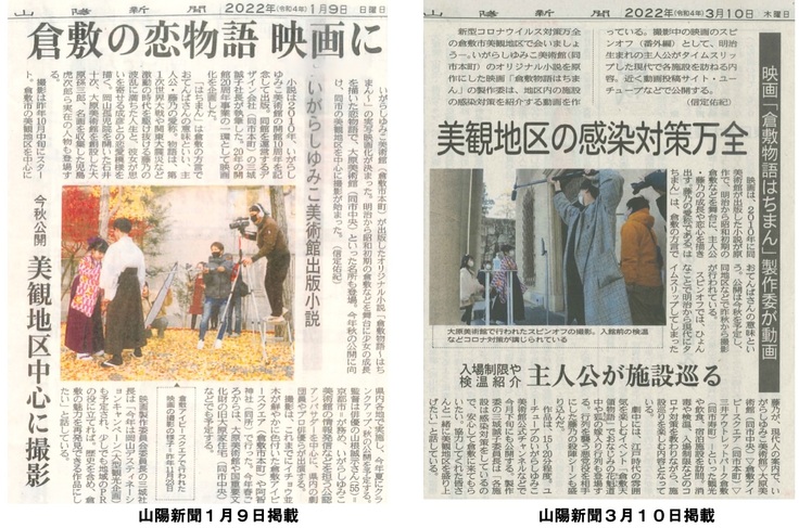 令和3年にいがらしゆみこ美術館開館20周年の記念事業の一環として「文化庁・文化芸術活動の充実支援事業活用」の採択を受け、倉敷物語特別展、及び令和4年には「文化庁・AFF2(コロナ禍からの文化芸術活動の再興支援事業)」の採択を受け、実写版での映画化が決定し撮影を開始しました。